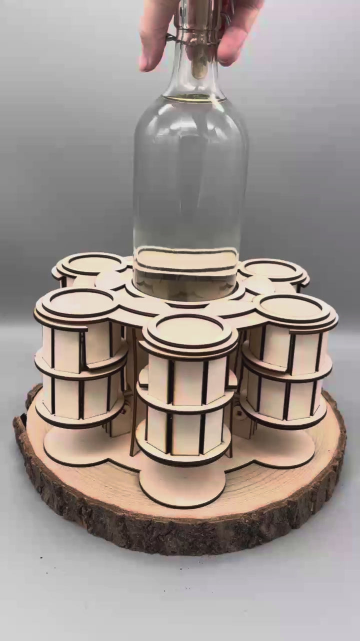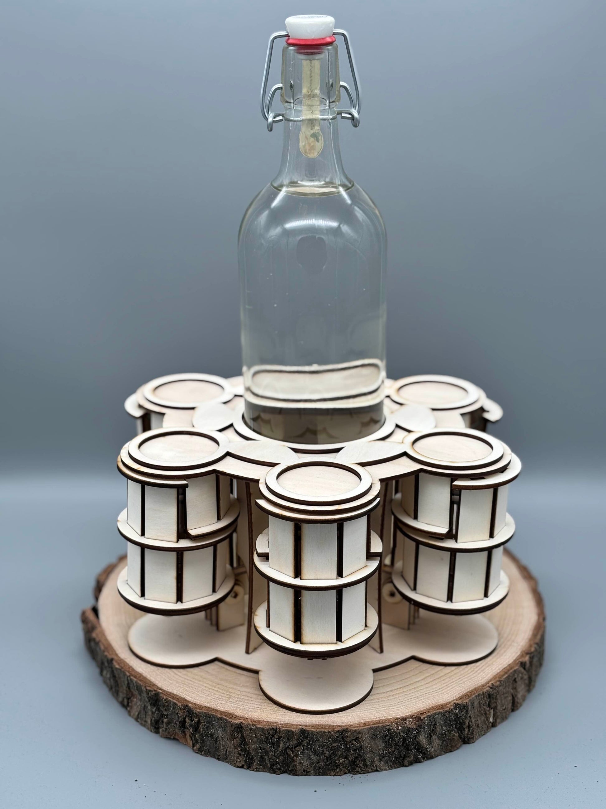 Einfach die Flasche mittig rausnehmen – klack! – und wie durch Zauberhand klappen sechs Gläschen (à 4 cl) rundherum aus, fertig zur Entnahme!